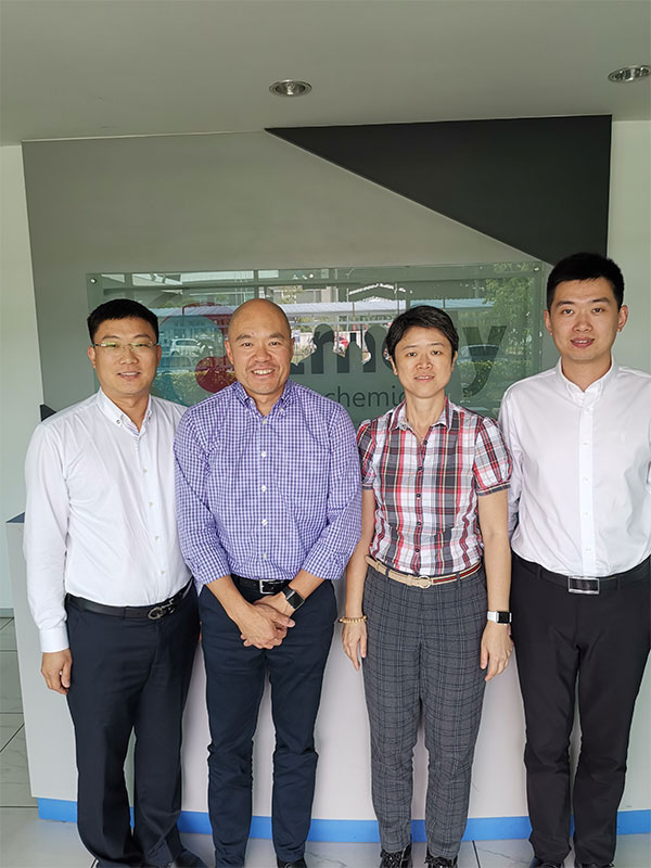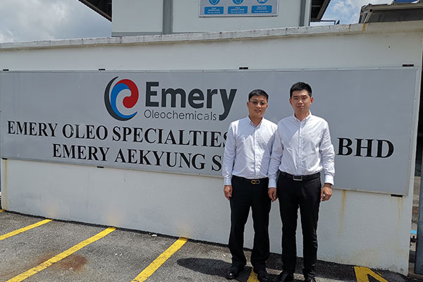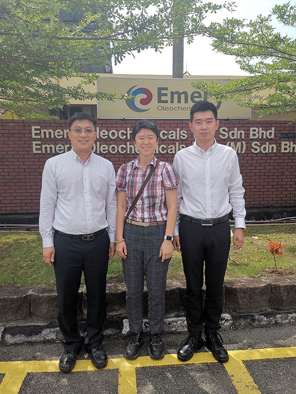 近年來(lái),隨著中國(guó)經(jīng)濟(jì)水平的提高,環(huán)保意識(shí)深入人心。作為可生物降解的V類(lèi)合成基礎(chǔ)油,酯類(lèi)油應(yīng)用越發(fā)廣泛,從配合PAO使用于發(fā)動(dòng)機(jī)油、潤(rùn)滑脂、風(fēng)電齒輪油、壓縮機(jī)油等,到單獨(dú)應(yīng)用于全酯型合成油脂、金屬加工液、化妝品等,酯類(lèi)油前景更加廣闊,需求量呈現(xiàn)持續(xù)增長(zhǎng)的趨勢(shì)。為了滿(mǎn)足國(guó)內(nèi)需求,作為專(zhuān)業(yè)從事化學(xué)品進(jìn)出口貿(mào)易的公司——上海棋成潤(rùn)滑材料有限公司副總經(jīng)理劉鋒先生、銷(xiāo)售總監(jiān)丁舸先生于2019年7月8日-10日赴馬來(lái)西亞Emery Oleochemicals總部進(jìn)行了參觀(guān)考察及學(xué)習(xí)交流活動(dòng)。