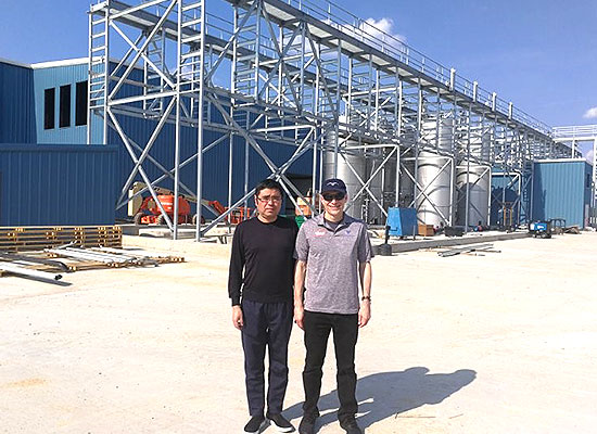 參觀產(chǎn)能5萬(wàn)噸的酯油(新建)工廠后棋成集團(tuán)董事長(zhǎng)龔惠江(左)與司馬化學(xué)美國(guó)公司銷售總監(jiān)Tyler(右)親切合影