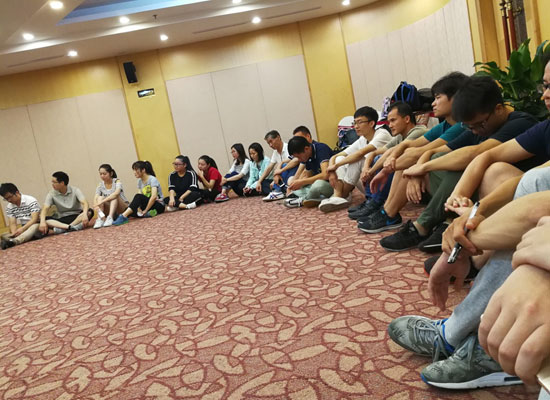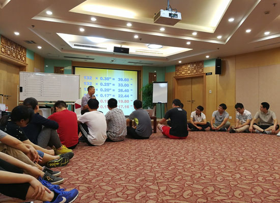 上午的課程主要圍繞個體開展的,下午主要圍繞團(tuán)隊的建設(shè)進(jìn)行的,講究各個部門之間的無縫對接。下午的課程學(xué)習(xí)是在一個游戲的基礎(chǔ)之上完成的。各部門同事一起配合,在不違反游戲規(guī)則的前提下,從1依次報數(shù)到132,用時不超過19.80秒,即為完成任務(wù),我們挑出周佐諭作為隊長。我們原來的計劃是26.4秒,在老師的一再要求下,選擇了看似很難達(dá)到的19.8秒。老師給了我們20輪的機(jī)會,每次報數(shù)有兩次機(jī)會,兩次都失敗,我們的隊長將做俯臥撐,接受懲罰,每次翻倍。
